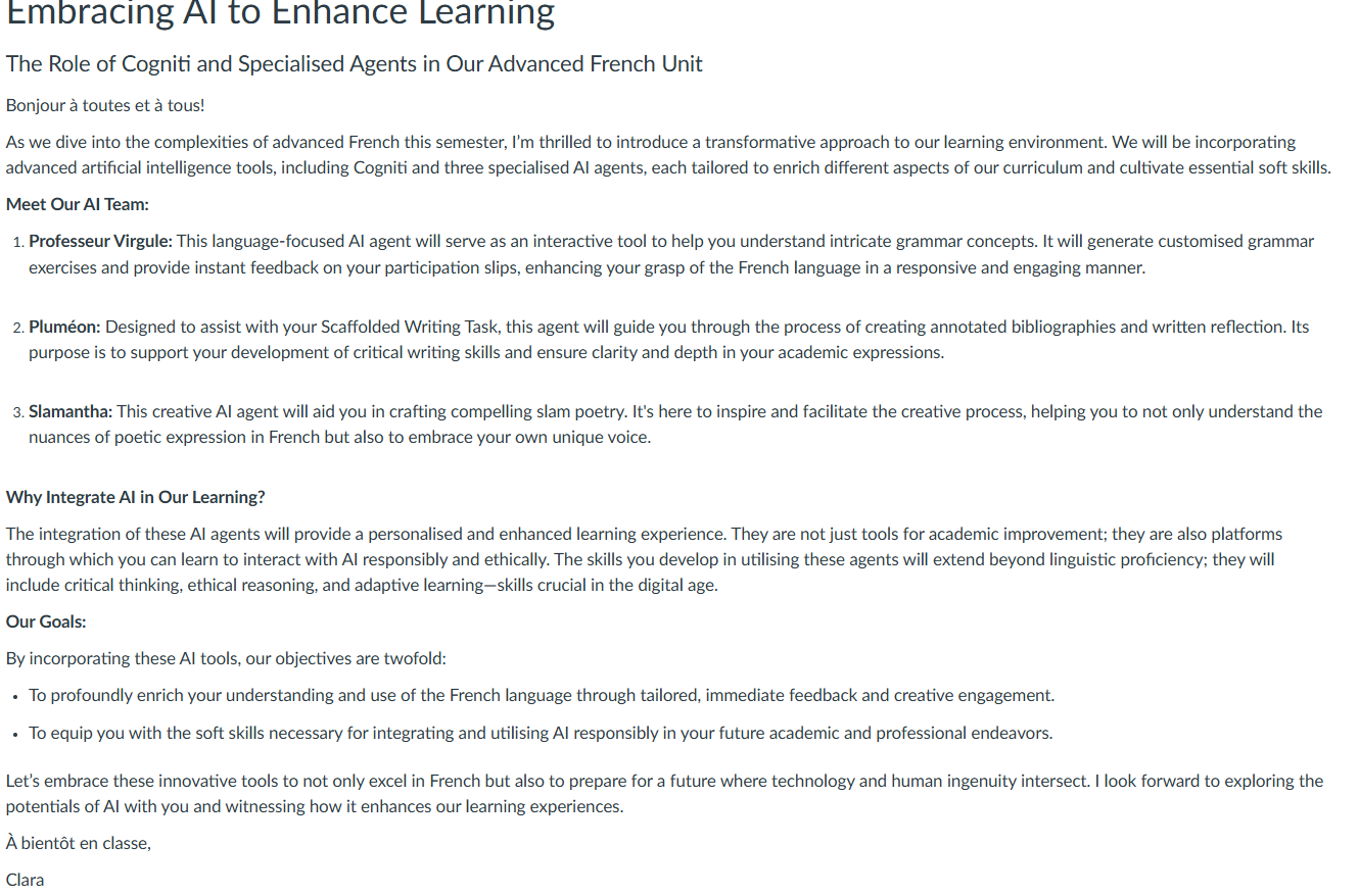 Before I go any further, I’d like to acknowledge that FRNC3002 French 6 was initially designed by my colleague Dr Carolyn Stott, who thought the materials and assessment structure through. When I took over the unit in 2023, I brought the emphasis on intercultural literacy, and the importance of empathy. In 2024, I started experimenting with AI.