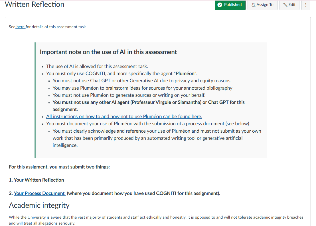 The use of these agents was mandated for all submitted assessment tasks. In order to maximise AI integration in this unit, explanations and instructions were explicit and detailed: