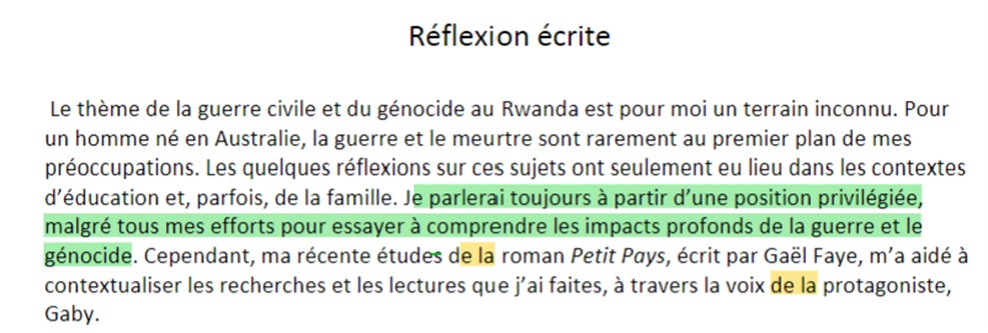 In our approach, decolonising the curriculum involves highlighting the underrepresented voices and narratives that shape today’s French and Francophone societies. In French 5 we look at France’s colonial past through the impact of the Algerian War and uprising in New Caledonia on French and Francophone societies today through authentic materials showcasing voices that are not typically heard in these spaces. In French 6, we use the works of Franco-Rwandan writer and hip-hop artist Gaël Faye to understand the impact of colonisation and the genocide against the Tutsi in Rwanda in contemporary France (Petit Pays (Paris: Grasset, 2016) and the album « Pili-Pili sur un croissant au beurre », 2013). In this piece I’ll showcase how we fostered intercultural literacy and empathy in this unit and briefly outline how we attempted to meaningfully integrate Generative AI. In French 6, we use Universal Design for Learning (UDL) and Cultural Trauma Literacy to delve into these complex histories. We explore traumatic events through various mediums such as literature and music, providing a holistic view that fosters empathy and enhances understanding among students.