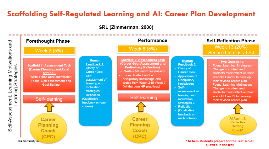 Our team in the Business School has been exploring how to flip this challenge: Rather than seeing AI as a threat to learning, we wanted to use it to strengthen students’ ability to think critically, reflect, and plan. In this post, we share how we designed an AI-powered career coaching tool to scaffold self-regulated learning in a postgraduate Human Resource Management (HRM) unit, and the design principles other educators can take from our approach.