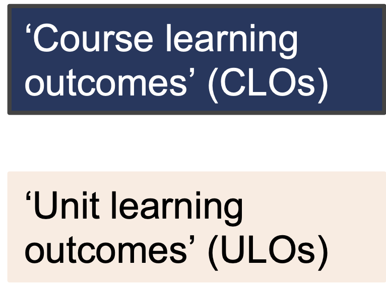 Unit learning outcomes (ULOs) explain how some (or all) of the CLOs and MLOs will be developed in the learning and assessment tasks that the student will undertake in their subject. Guidance on writing ULOs and aligning them to the course outcomes is available. Where a ULO is used to assure a CLO, it must be measurable and assessed securely through either a hurdle task or weighted at 50% or higher. Where it is not used for assurance at the course level, it may be assessed purely through open assessment.