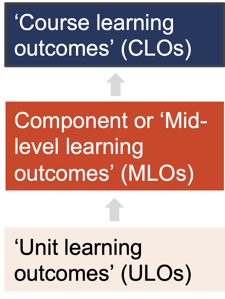 Unit learning outcomes feed into mid-level outcomes in degree components such as majors. These feed into the course learning outcomes.